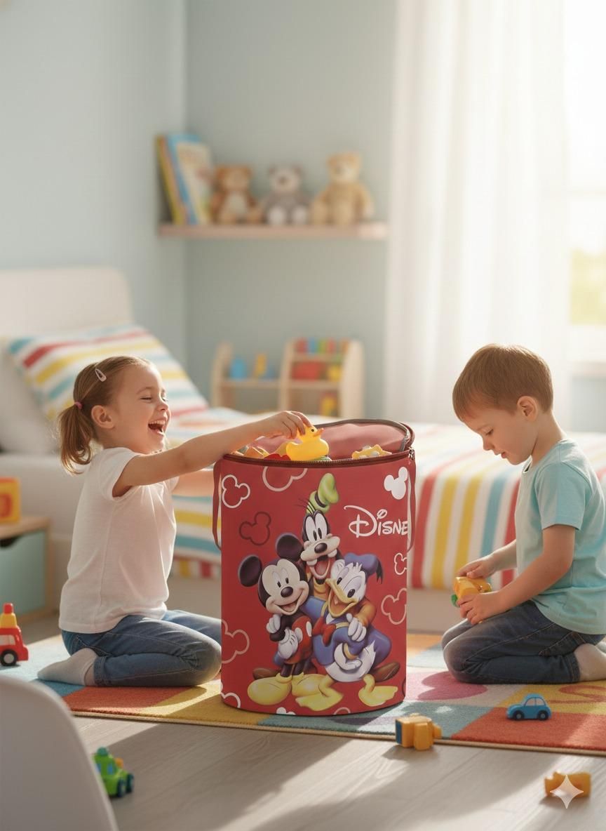 Keep your home organized with this convenient Laundry Basket With Handles combo pack of 2. Crafted from durable polyester with a charming Disney Print in cream, each basket measures 34 cm x 34 cm x 42 cm and weighs just 262 gms. Featuring safe, child-friendly design with no sharp edges, these baskets are perfect for storing laundry, toys, or household items. The foldable design saves space when not in use, making them ideal for any home. Practical handles make carrying effortless, while the sturdy construction ensures long-lasting use.
